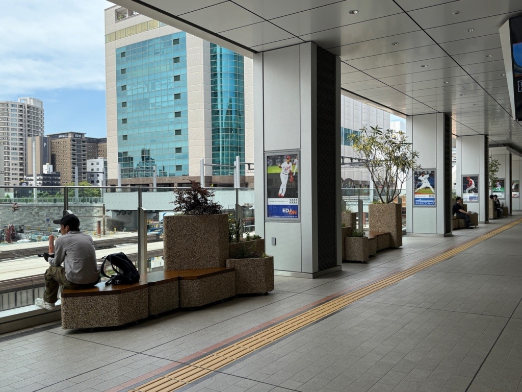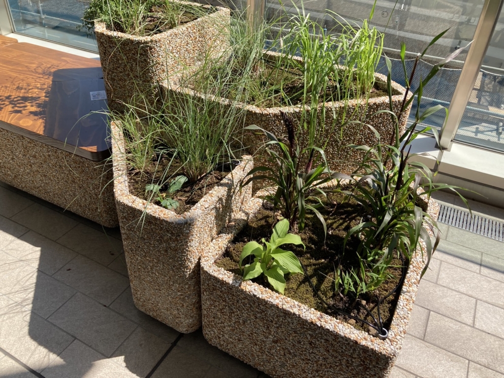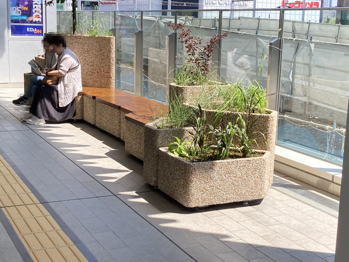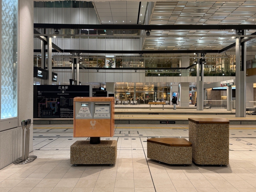 広島駅の再開発プロジェクトにおいて、駅前空間に設置される植栽ブロック、ベンチ、郵便ポスト土台ブロックを